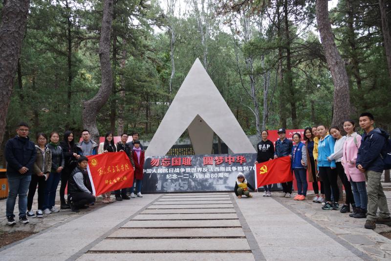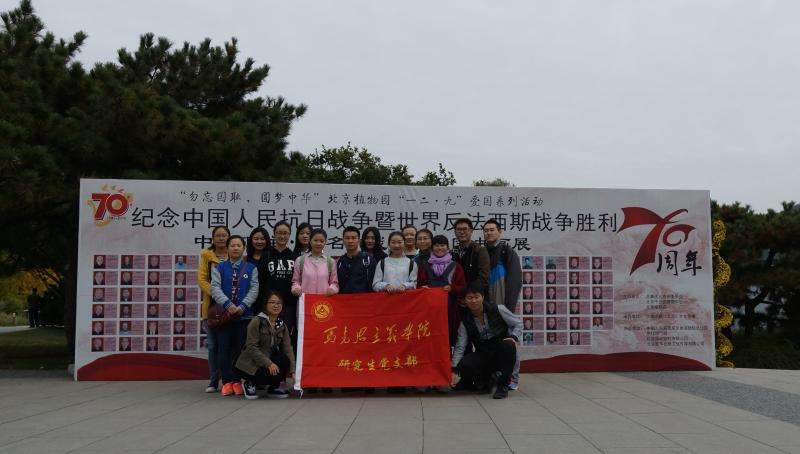 秋高气爽,清风徐徐,马理论专业党员同学早早到达北京植物园,参观学习“勿忘国耻,圆梦中华”宣传展板。在仔细阅览展板内容之后,同学们交流了心得体会。为了更近距离了解抗日战争历史、体会爱国先烈激情,支部成员兴致勃勃地前往北京市爱国主义教育基地——一二·九运动纪念亭和保卫华北石刻。