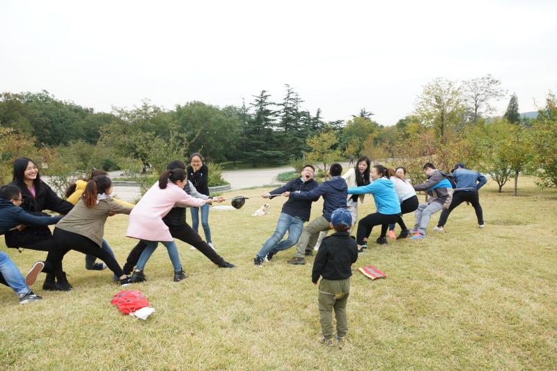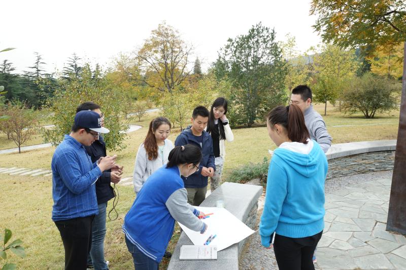 接受爱国主义教育之后,同学们开始素质拓展活动。首先进行了自我介绍的滚雪球游戏,小游戏增进了同学们之间的了解,拉近了彼此的情感距离。随着活动气氛升温,大家起身动起来。先是进行坐地起身的小团队比赛,随后开展了找宝藏游戏,最后举行了拔河比赛。大家在寻宝过程中积极投入,拔河时两队队员卯足劲头,互不相让,快乐气氛爆棚!最后两队还设计队徽队歌队舞以及吉祥物,在欢声笑语中结束了素质拓展活动。