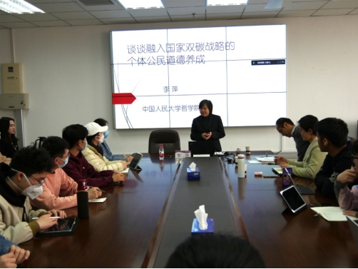 王润稼副经理就李萍教授的精彩讲座进行了总结。他认为李教授的讲座内容丰富,富有新意,将国家双碳战略与个体道德培育有机结合,在双碳实践中将个体与群体、社会、国家以至天地自然予以联动性、系统性的对待,以此有效实现集体行动与伦理团结,使我们在积极的日常实践中培育起公民美德。